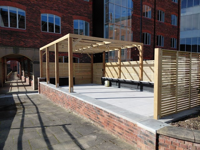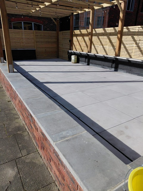 A recent job has been this patio area in Central Leeds. We did this through the removal of 80 tons of soil from planters in small loads as access was tight. We then completed the installation of ACO drains and a concrete slab for base. Finished off by grouting and laying large porcelain flags to completely transform this space.