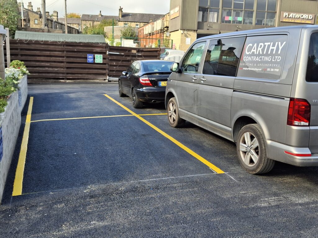 A very recent car park resurfacing job carried out at a pub in Huddersfield. Large areas of extremely deteriorated tarmac planed out and re-based, followed by a full machine laid tarmac resurface of the entire car park. Thermo lining to mark out parking bays on completion.